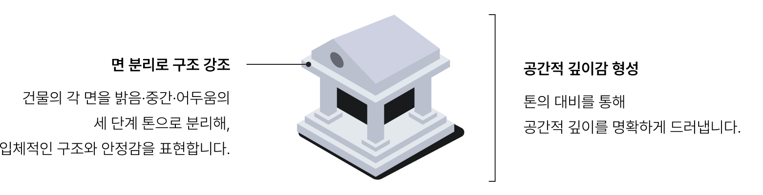 동일한 색상군 안에서 밝음/중간/어두움의 2~3단계 톤을 사용하여 깊이감을 표현합니다.