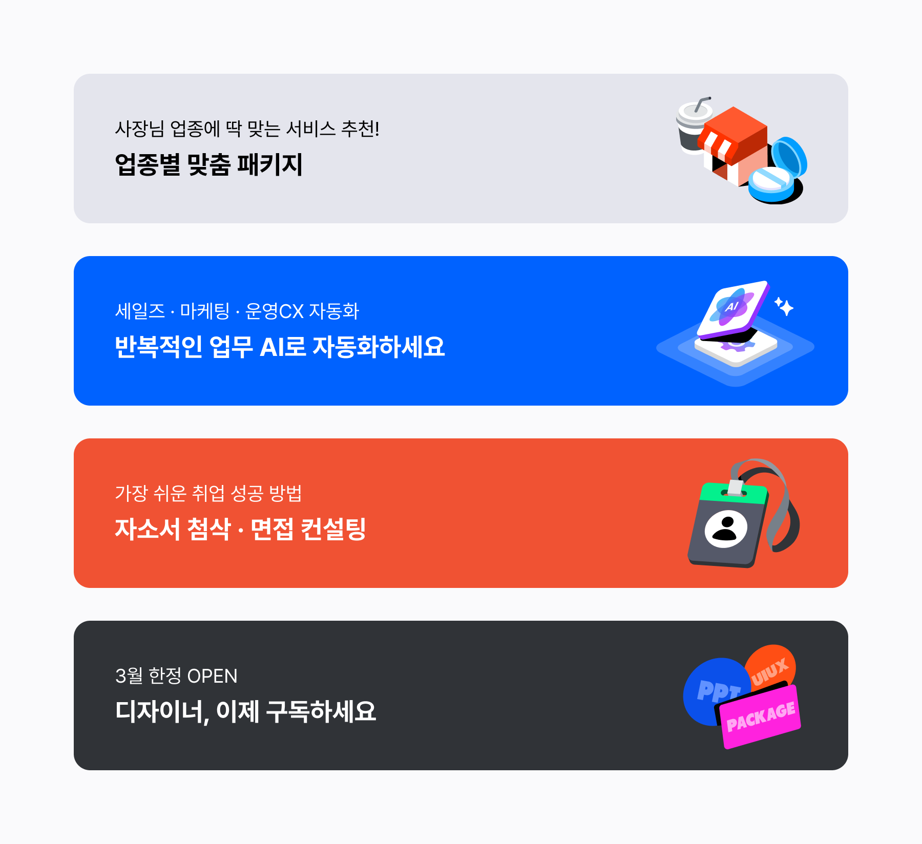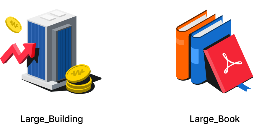 다양한 사용자 접점에서 시각적 인상을 형성하고, 시각 경험을 강화하기 위한 그래픽 요소입니다.서비스의 성격, 전달하고자 하는 메시지, 노출 범위에 따라 Small, Medium, Large 세 가지 타입으로 구분되며, 크기와 묘사 수준에 따라 적용할 수 있도록 설계되었습니다.